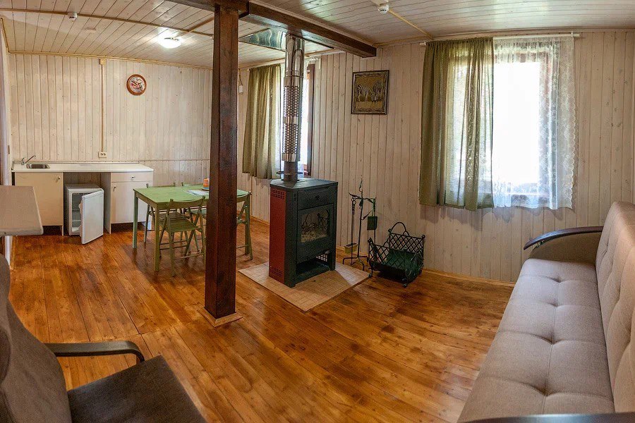 Номер расположен в двухэтажном доме на 1-ом этаже. Комфортный номер с террасой на первой береговой линии, с которого открывается вид на Катунь и горы. Рядом с домом расположена большая беседка и мангальная зона. В номере две изолированных спальни с двуспальными кроватями и уютная кухня-гостиная. Оснащение кухни : СВЧ, индукционная плита, холодильник, чайник, полный набор посуды для приготовления и приема пищи. Ванная комната со всеми удобствами и индивидуальным большим бойлером, фен.